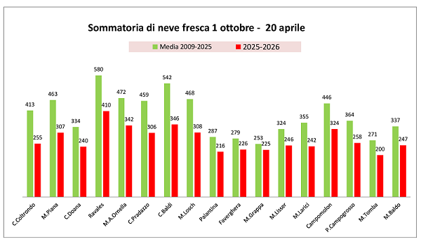 Commento: Precipitazione nevosa misurata presso le stazioni nivometriche gestite da Arpa Veneto e media del periodo 2010-2025. Il deficit di neve fresca è di 150 cm per le Dolomiti, 80 cm per le Prealpi.