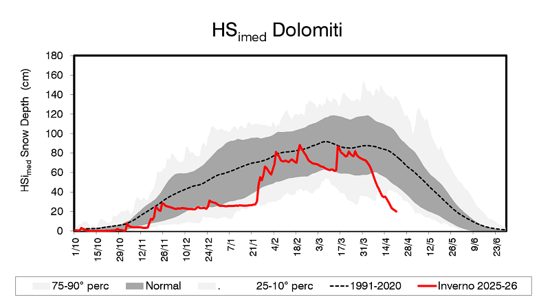 Commento: Lo spessore medio della neve in quota nelle Dolomiti rappresentato dal parametro HSimed, è inferiore al 10° percentile ed è classificabile come "evento raro". La mancanza di nevicate, le piogge fino in alta quota ma soprattutto le temperature miti del periodo 2-20 aprile, più caldo in assoluto almeno dal 1991, hanno generato una rapida fusione del manto nevoso. L'estensione della copertura nevosa è inferiore alla media e la risorsa nivale (SWE) scarsa.