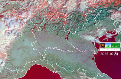 Commento: L'italia settentrionale come appare in questa immagine del 24 ottobre ripresa dal sensore MODIS installato a bordo del satellite Terra. La perturbazione che è transitata sulle Alpi il 23 ottobre ha portato neve in quota sulle Alpi settentrionali e meridionali, dall'Adamello alle Dolomiti. Nell'immagine delle ore 09:45 solari (UTC+1) è possibile distinguere la neve color rosso sulle Alpi Retiche, sulle Alpi Noriche e sulle Dolomiti. Gli apporti di neve a 2500 m sono stati molto variabili, da 5 ai 20 cm. Un po' di nuvolosità lungo la cresta di confine con l'Austria nasconde il maggior innevamento dell'Alto Adige