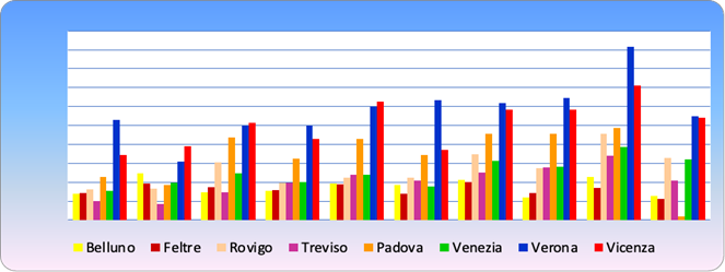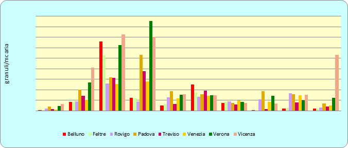 Il 2020 è stato l’anno con maggior concentrazione pollinica in tutti i siti e il 2013 quello a minore quantità. Aceracee, Betulacee, Cupressacee sono presenti soprattutto nella zona di pianura e litoranea, specie a Treviso, Verona, Vicenza e Venezia, le Platanacee in pianura e nell’ovest della regione (Padova, Rovigo,Verona). Le Salicacee sono rilevate specialmente nel sito planiziale di Rovigo, mentre nella zona montana (Belluno e Feltre), le Corylacee e le Oleacee ( genere Fraxinus) sono la famiglia più rappresentativa. Il genere Olea è particolare della zona veronese. Le erbacee hanno evidenziato trend di maggior concentrazioni nella pianura e verso il litorale rispetto alle zone montane, in particolare le Amarantahcee nel sito di Rovigo e le Composite nel’ovest della regione.
