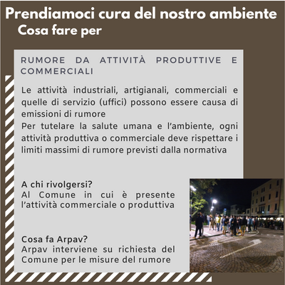Gli insediamenti produttivi (attività industriali e artigianali), le attività commerciali (bar, discoteche, pubblici esercizi) e quelle di servizio (uffici) possono essere causa di emissioni di rumore